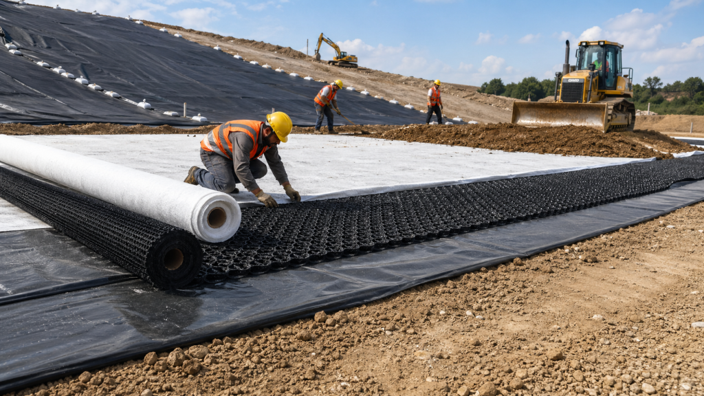 Geonets are often used together with geotextiles and geomembranes because each material performs a different function. The geonet core provides in-plane flow capacity. The geotextile works as a filter layer to block soil particles and reduce clogging. The geomembrane acts as the impermeable barrier for containment.