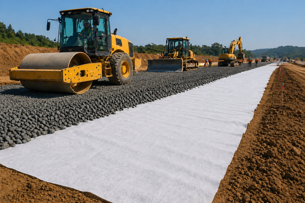 In road engineering, geotextiles act as a separation and filtration layer between the subgrade and aggregate. They prevent fine soil particles from moving upward while allowing water to drain effectively. As a result, the road structure remains stable over time.